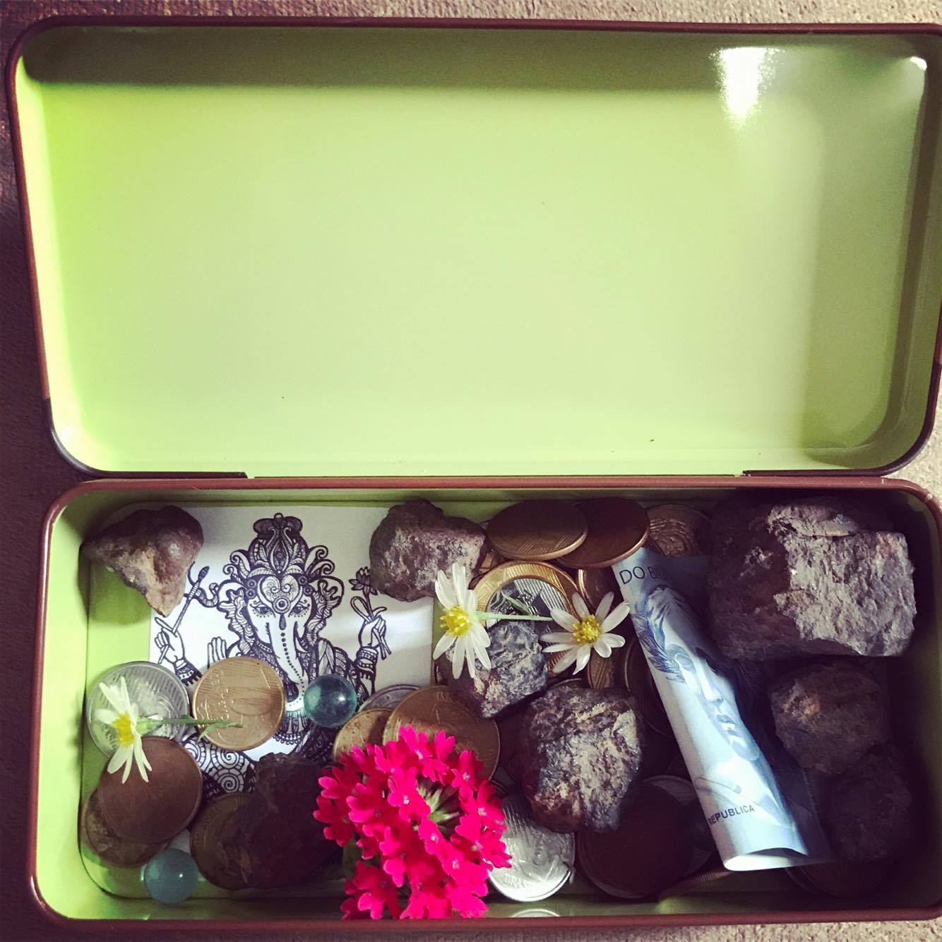 Então conjure elemento por elemento, cada cúrio de uma vez… primeiro a imagem de Ganesh, depois as moedas e cédulas, depois as pedras… conjure e coloque dentro da caixa… você pode adicionar a sua caixa, algumas piritas, e se você tiver algum óleo magico do Hoodoo, como óleo ganesa, ou óleo dinheiro fique comigo, ou óleo madame fortuna… você pode guarda-los dentro dessa caixa, isso irá potencializa-los.