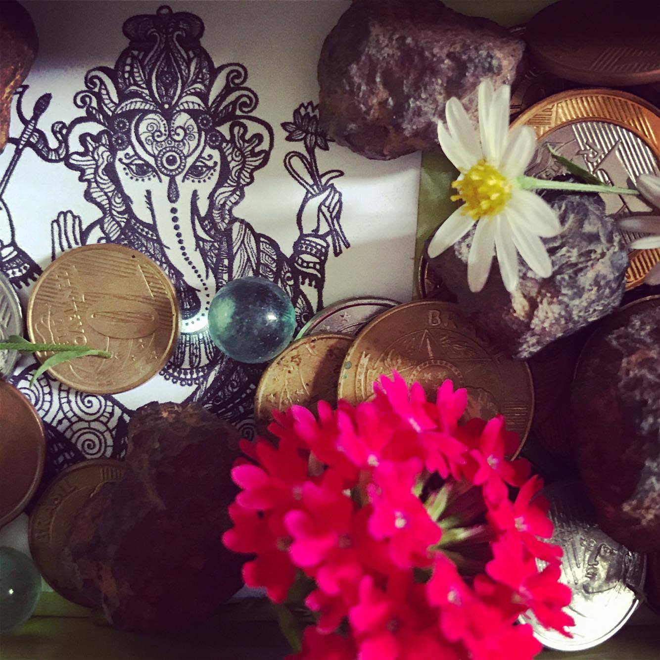 • Outros Cúrios – as vezes ofereço flores a Ganesh, e deixo que elas sequem dentro da caixa, as propriedades das flores também são importantes, a Verbena serve para muitos propósitos como amor e proteção, para proteger meu dinheiro, e meus investimentos, uso então a verbena. E coloco algumas flores de margarida também, que simbolizam a “luxuria”…