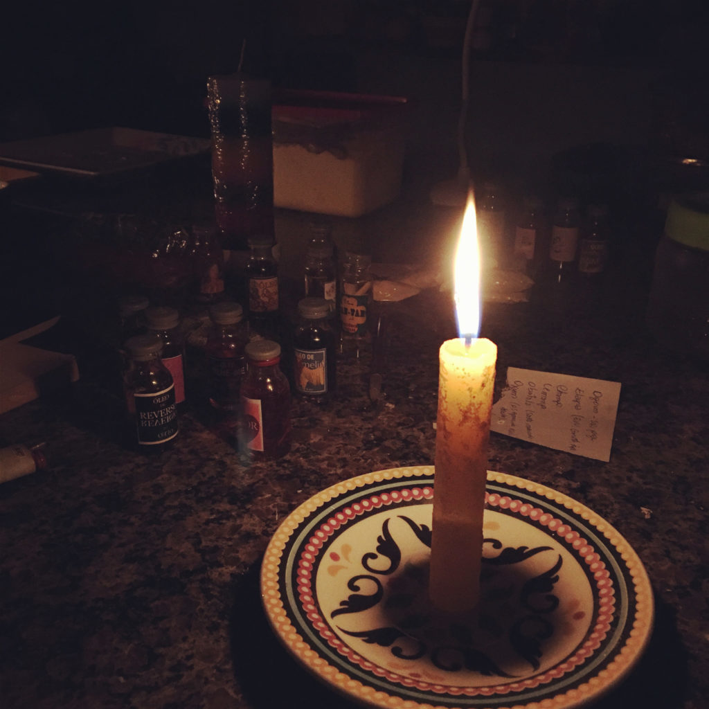A vela é composta de cera – parafina e pavio. É moldada no calor, o ar a faz secar. Ela em si contém a solidez da terra, mas enquanto queima contém a liquidez da água. A vela é um dos instrumentos mais poderosos de um Conjure ou Rootwork.