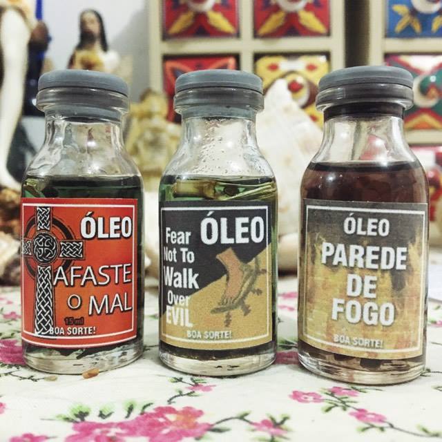 Coloque algumas gotas do Óleo Afaste o Mal nas palmas das mãos, friccione bem, e passe na cabeça, no pescoço, no peito, nos braços e antebraços, na barriga, nas coxas, nas pernas e nos pés…